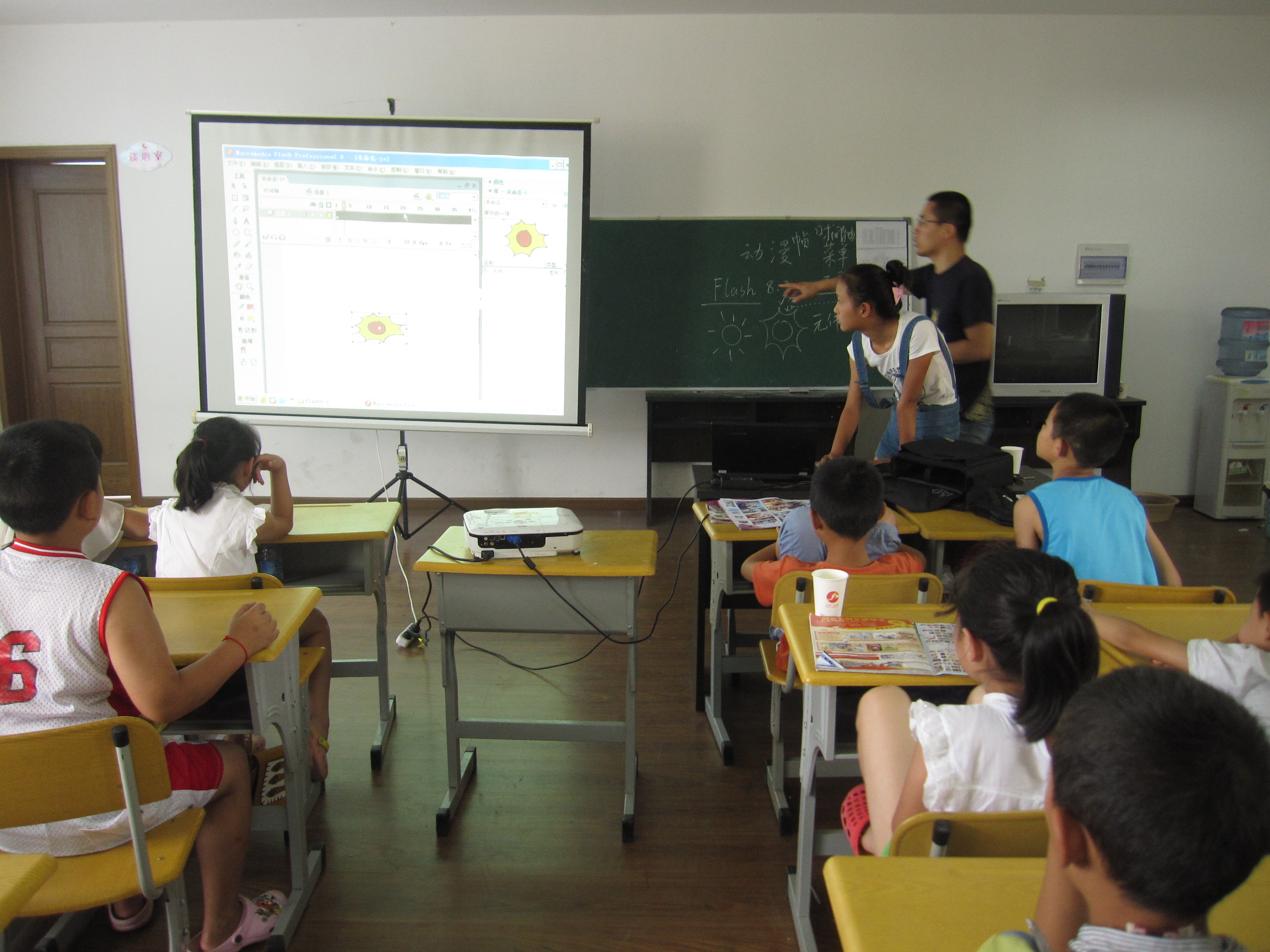7月23日上午,小门村假日学校请来了一位郭巨中学姚成伟老师,姚老师首先通过PPT介绍了什么是动漫,如何制作动漫让小朋友们有一个大致的了解。然后老师在电脑上画了一个太阳并涂上颜色用下载的软件让太阳自动旋转,生动形象的课程深深地吸引了小朋友们,个个看得目瞪口呆,都觉得非常神奇,老师还让小朋友一个个上台操作,让他们对动漫制作有了更进一步的了解。