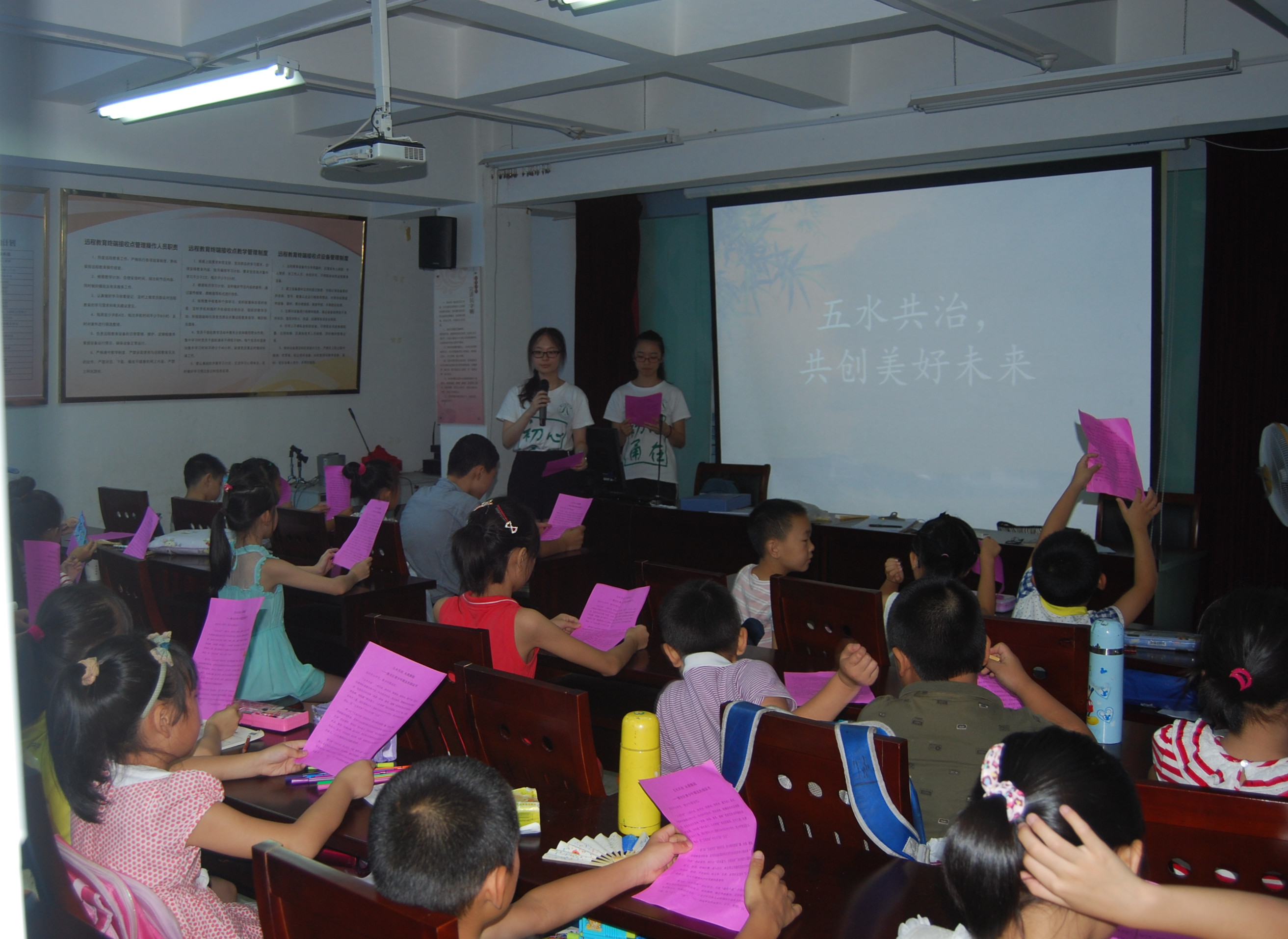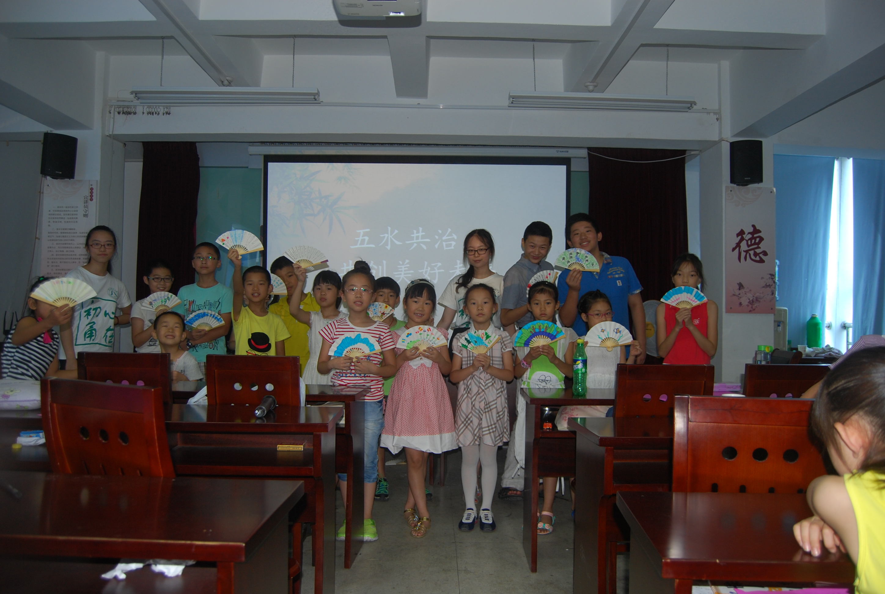 7月24日上午,海棠社区暑期“健康”假日学校开展了“五水共治”宣传教育活动。来自浙师大初阳学院和浙工商的支教志愿者老师们用创意画扇的形式,让孩子们亲自动手画出理想的清河小溪、碧水蓝天。