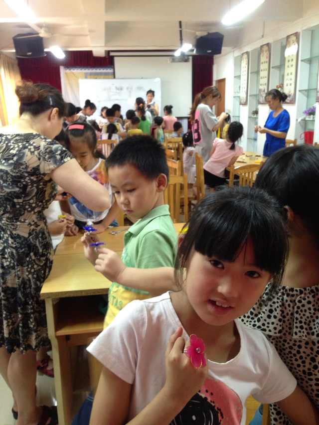 课上,她先用网上的图片做例子,自己示范着用纸杯做了一朵花,并用彩纸进行装饰。应学生们的强烈要求,林丽丽老师之后做的企鹅也让学生们啧啧称道。示范完毕,该是学生们制作的时间了,他们用之前就分发的材料开始动手制作。期间,林老师教育学生们,纸杯虽然能变出各种动植物,但是日常生活中最好还是尽量不使用纸杯,告诉学生们要环保。过程中,林老师帮助有需要的学生并加以指导,对完成的作品提出修改意见。到了展示作品的时间,有企鹅、章鱼、花等等,还有一对天使与魔鬼,都是栩栩如生,生动可爱。
