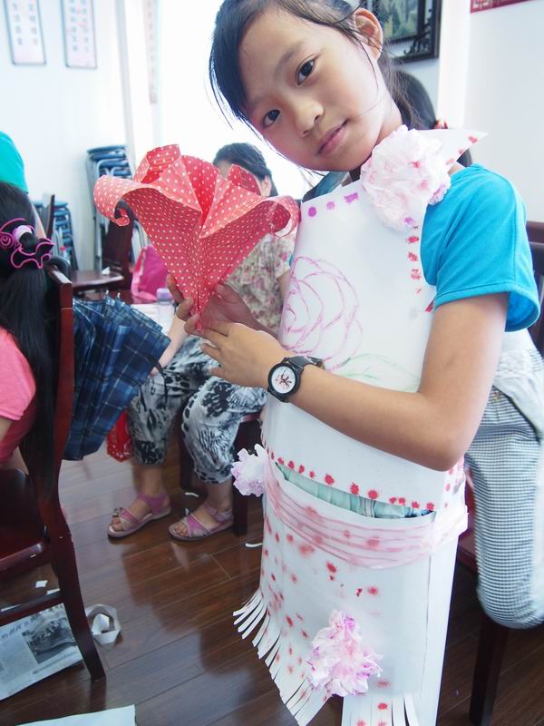 孩子们在社区五老志愿者、大学生志愿者的引导下拿起画笔剪刀,从自身喜好以及性格出发,三两合作,进行大胆的戏服创作。有的制作了自己喜爱的英雄人物戏服,一手持宝剑,一手持盔甲,威武非凡;有的制成了精美的晚礼服,贴上蝴蝶结,手持花朵,美丽高贵;更有甚,用纸巾做成花朵,喷上水彩,装饰在俏皮的服装上,宛若出自服装设计师之手;平时大大咧咧的小男孩们也变得心灵手巧,小背心、小裤子信手拈来。课堂上满目所见,是热烈的讨论,是分工合作。老师们也积极指导,穿梭在孩子们之间。当孩子们穿上自己历时两小时制成的衣服时,脸上露出了灿烂的笑容。